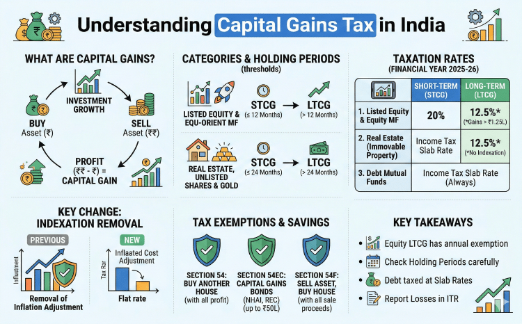 A comprehensive guide to understanding Short-Term and Long-Term Capital Gains tax in India, covering equity, debt, real estate, and gold for the financial year 2025-26.